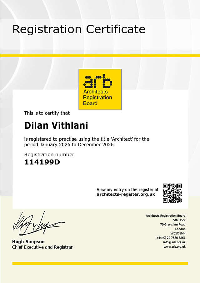 As part of this significant career progression, Dilan has also received his registration certificate with the Architects Registration Board (ARB). Registration with the ARB represents a major professional milestone, formally recognising Dilan as a qualified architect and confirming that he meets the rigorous standards required to practice architecture in the UK. The term ‘Architect’ is a protected status and considering the amount of effort and time Dilan has invested in his studies we strongly support this protection.
